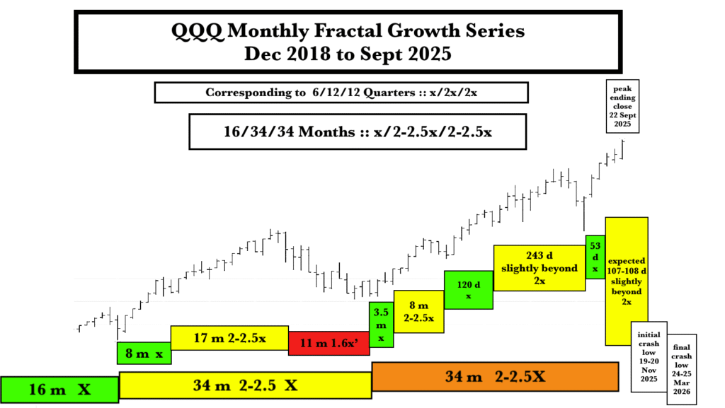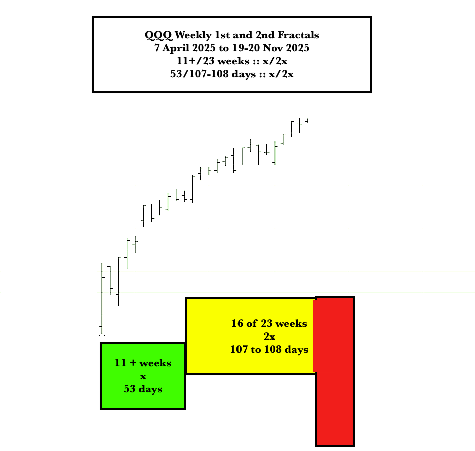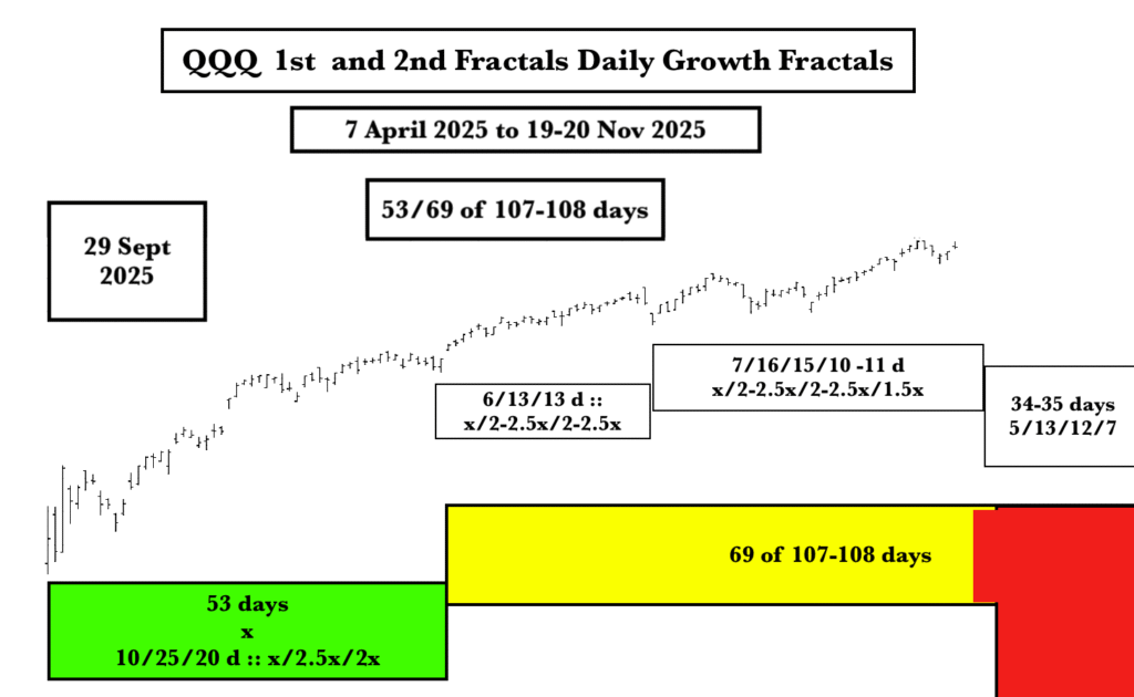 The 1st and 2nd fractal series starting 7 April appears to be a 53/107-108 day :: x/2x fractal series ending 20-21 Nov 2024 with an interim low on 14 October. 4 identifiable subfractal series make up the 107-108 day second fractal. The lengths of the 4 subfractal series are shown in diagram. A final 27-28/55-57 day:: x/2x 1st and 2nd fractal series could place a final SPX low on 24-25 March 2026.