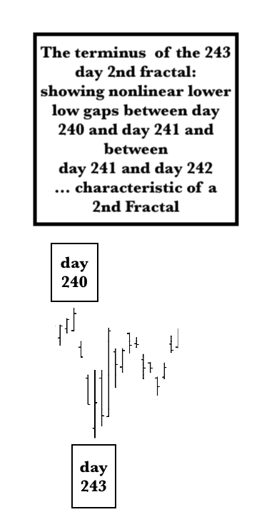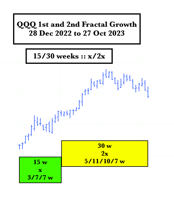 After the Covid March 2020 low, US Equity composites followed a 8/17/11 month fractal : x/2-2.5x/1.5x’ 3-phase fractal series. Since the December 2022 8/17/11 month low ending fractal series, equity growth has self assembled in a series of 1st and 2nd fractal groupings: 15/30 weeks :: x/2x ending on 27 October 2023 and 26/52 weeks :: x/2x ending 7 April 2024 . The 2nd fractal nadir low ending valuation has come shortly after a 2x time length and within 2-4% of the 1st fractal base time length x. For example, the 27 Oct 2023 1st and 2nd fractal series were 120/243 days in length. Nonlinearity occurred after 2x or day 240 with nonlinear lower low gaps between day 240 and 241 and day 241 and 242.