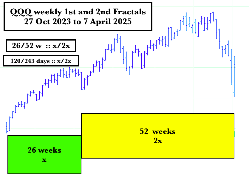 The 2nd fractal is characterized by terminal gapped nonlinear lower lows between the 2nd fractal’s terminal 2x and 2.5x time period. (These gapped nonlinear lower lows can be observed in weekly valuation units for the DJIA between 1929 and 1932, the terminal portion of the US 90 year 2nd fractal; within the last three day before the terminal 5 August 2024 139 day 2nd fractal low occurring in an interpolated ACWI/SPX 27 October 2023 55/139/135-136 day (SPX-ACWI respectively) :: x/2.5x/2.5x valuation maximum growth series ending on 18/19 February 2025: and can be expected within the last months on a daily and weekly basis of the current 32 of 33 year 2nd fractal of the interpolated 1982 13/32 of 33 year 1st and 2nd fractal series. (The 27 October 2023 dominant fractal series now appears to have a 120 day first fractal base with a 243 day 2nd fractal ending 7 April 2025, whereas the 55/139/136 day 3 phase growth series was a secondary interpolated fractal series).