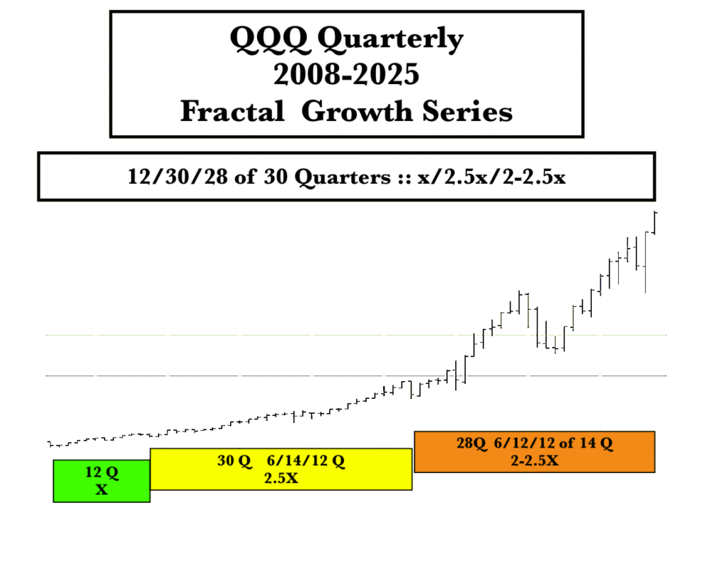 The original 4 phase model of time-unit based fractal cycles was expanded to a x/2x-2.5x/2x -2.5x/1.5-1.6x fractal series which describes the 1807 US 36/90/90/54-58 year large scale fractal cycle ending in the 2070’s. As well, a 3 phase fractal cycle of x/2x-2.5x/1.6x to 2x to 2.5x self assembles for interpolated sub cycle valuation growth and decay.