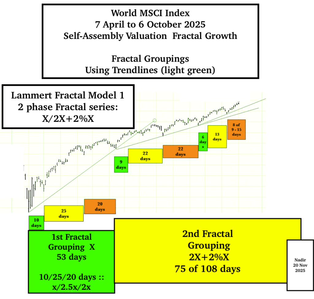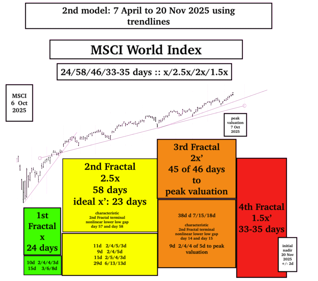 The MSCI world index composite is self-assembling, using the underlying trendlines, in a highly ordered Lammert fractal growth pattern since 7 April 2025. There are two models of interest: a 2 phase fractal series and a 4-phase fractal series … both ending with an initial crash nadir on November 20, 2025 plus or minus a few days.