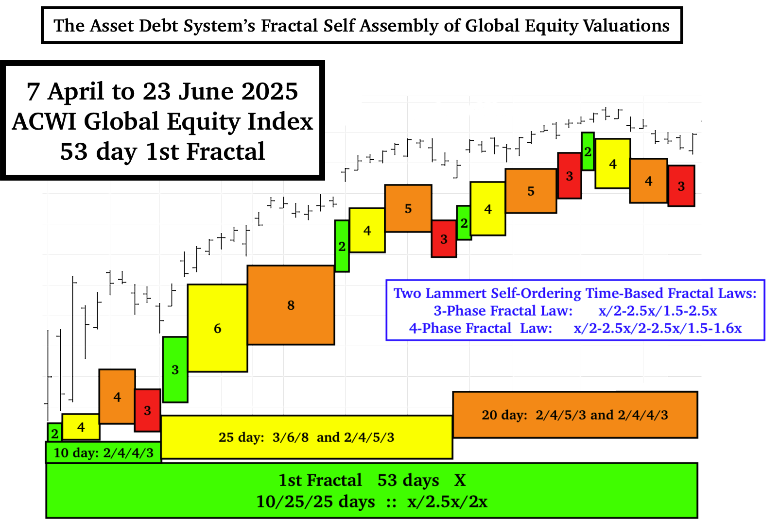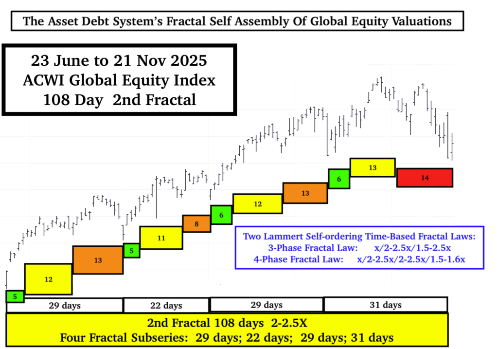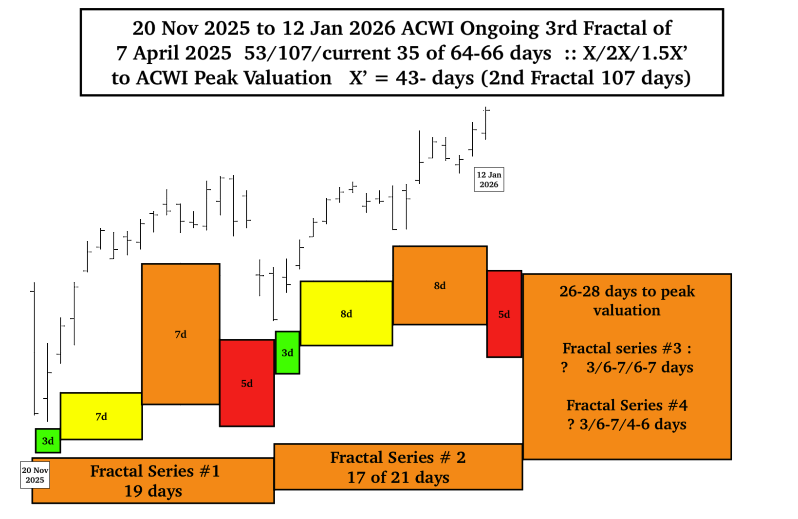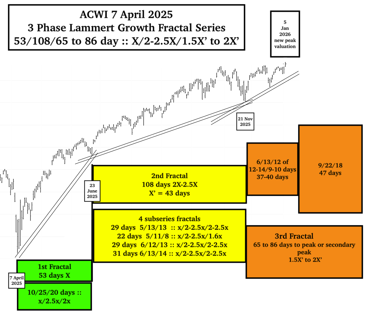 The global ACWI equity index made a new high valuation today confirming the end of a 108 day 2nd Fractal on 21 November 2025 and a coincidental 21 November 2025 incipient 3rd fractal growth of a self assembly 7 April 2025 53/108/65-86 day :: x/2-2.5x/1.5-2x’ terminal 3 phase daily fractal series … concluding growth of a 1982 13/33 year 1st and 2nd fractal series and concluding growth of a 2009 11-12/29-30/30 quarter :: x/2.5x/2.5x terminal maximum fractal growth series.