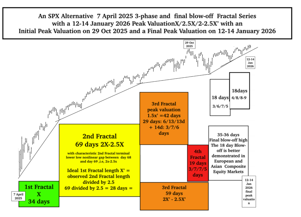 An alternative to the 7 April 2025 53/107-108 day/ 1.5x’- 2.5x’ final SPX fractal growth pathway exists. In this model, the termination of the 69 day second fractal has the characteristic nonlinear terminal 2x-2.5x time frame lower low gap between day 68 and day 69 of the second fractal with a 1st fractal base of 34 days. The ideal 1st fractal base x’ for a 2nd fractal of 69 days is 28 days x’ (69 divided by 2.5) with a 3rd fractal peak on day 42, 29 Oct 2025, 1.5x’ and a 3/7/7/5 day decay series to a 59 day nadir 2-2.5x’ on 21 Nov 2025. Two 18 day sequential fractal series take the SPX to a final high on 12-14 January 2026.