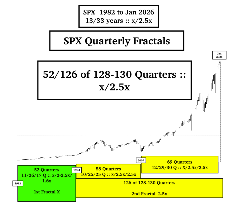 The SPX, proxy for the global composite equity valuation, is observed to be completing a 3-phase 2009 12/29/30 Quarterly :: x/2.5/2.5x maximum Fractal Growth Series and a 1982 to 2026 52/126 of 128-130 :: x/2.5x Quarterly Blow-off Valuation and Crash series.