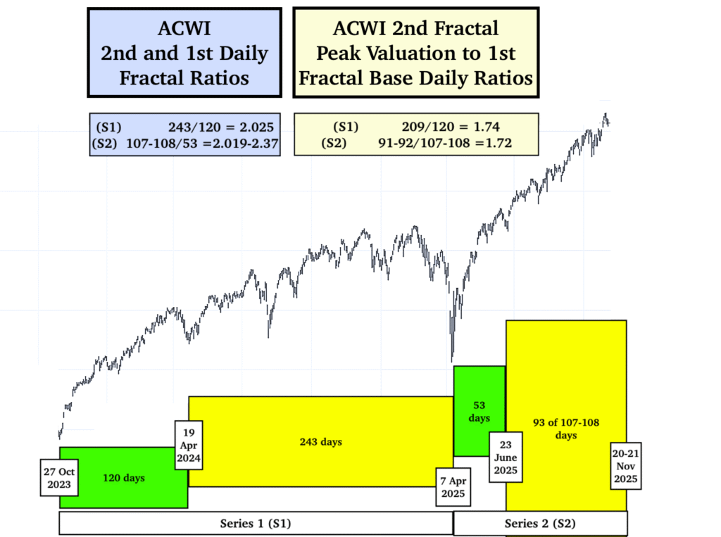 Below. The ratio of the 90/91 day second fractal peak valuation to the 7 April 2025 53 day first fractal base and the ratio of the length of the 107-108 day second fractal to the 53 day first fractal closely match the preceding 27 Oct 2023 similar ratios.