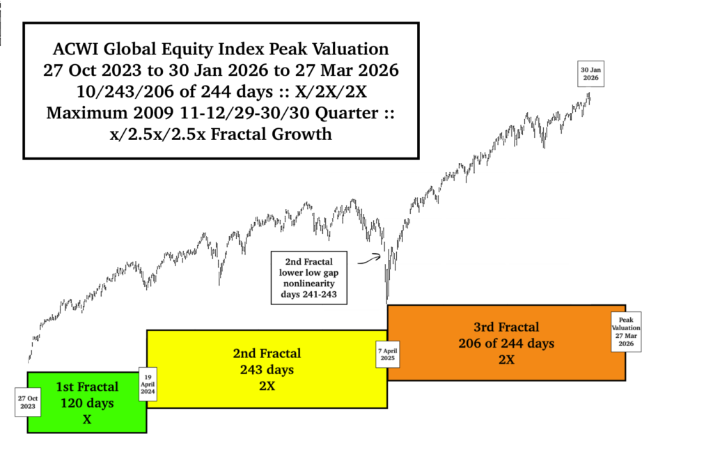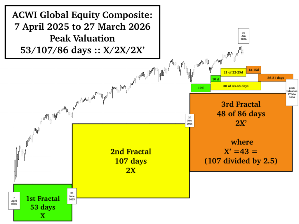 While there will be counter valuation growth cycle after the 27 March 2026 ACWI Global Equity Valuation Peak, the 1982-2026 13/33 year :: x/2.5x 1st and 2nd fractal global equity crash will occur over a relatively short time frame.