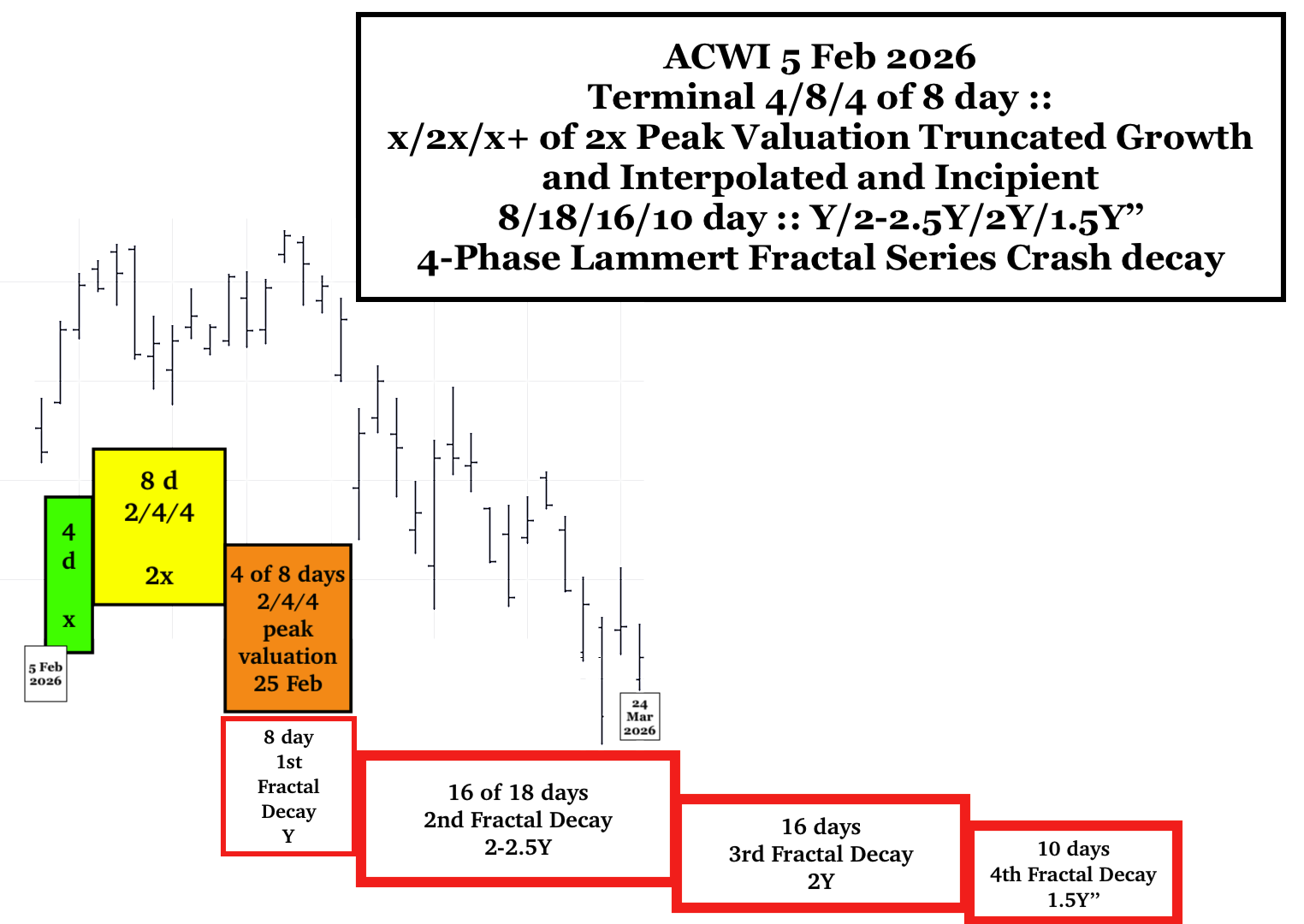 To the 25 Feb 2026 ACWI peak: a truncated 3-phase growth fractal series: 5 Feb 2026 4/8/4(25 Feb peak) of 8 days :: x/2x/2x. The 8 day 3rd fractal becomes the 1st fractal decay base of a 8/18/16/10 day :: y/2-2.5y/2y/1.5y” 4-phase crash fractal decay series. Today 24 March was day 16 of an 18 day 2nd fractal with expected lower low terminal 2nd fractal nonlinearity during the next 2 trading days.