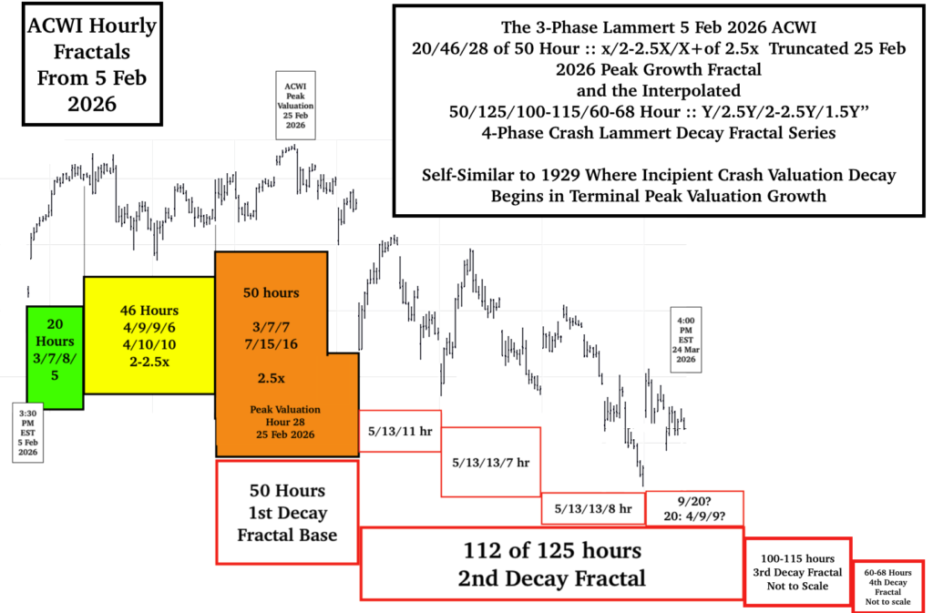The corroborating ACWI hourly fractal series coincident to the above daily series is a 5 Feb 2026 3:30 PM EST 20/46/50 hour :: x/2-2.5x/2.5x 3-phase truncated growth series with peak valuation on 25 Feb, hour 28 of the 50 hour 3rd fractal. The 50 hour 3rd fractal becomes the base fractal for a 50/125/100-115/60-68 hours ::y/2.5y/2-2.5y/1.5y” where y” is 1.5 times ( the 3rd decay fractal length divided by 2.5) The 125th hour low of the 2nd fractal is anticipated at 330 PM EST 26 March 2026.