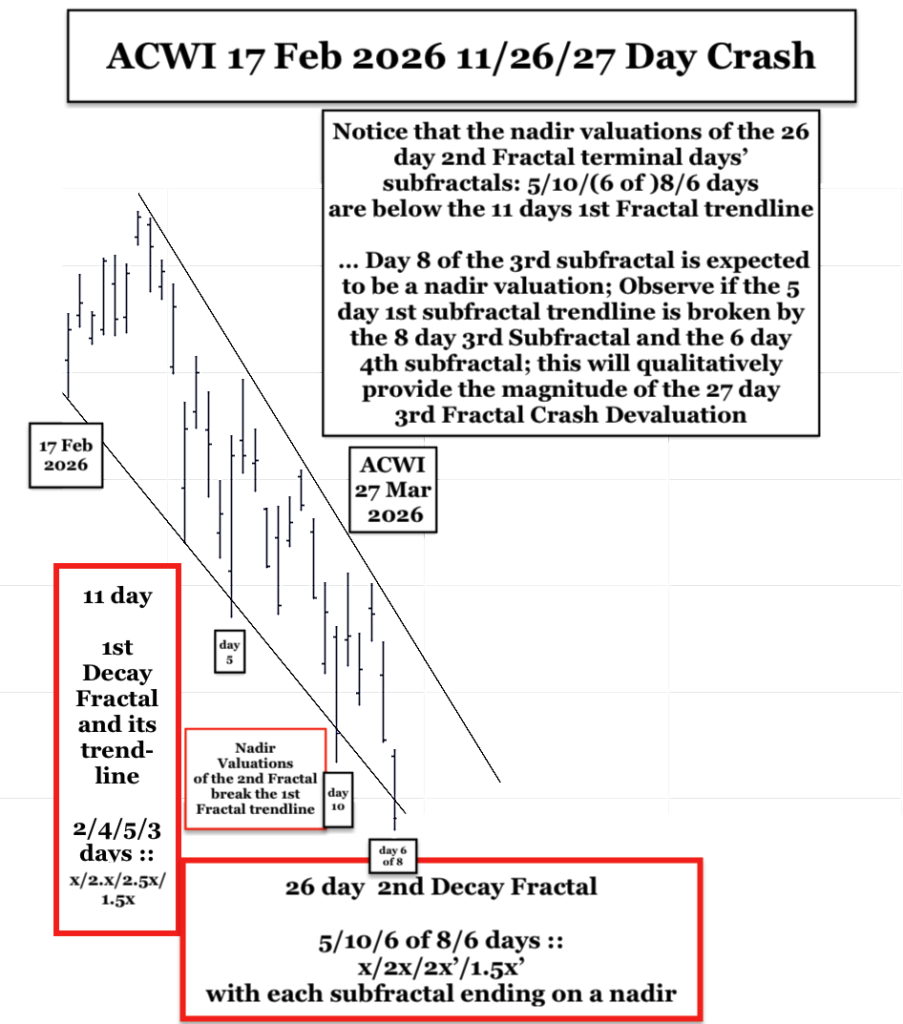 Observation of the ongoing 17 Feb 2026 11/26/27 day :: y/2.5y/2.5y crash decay fractal series shows that day 5 and day 10 of the 26 day 2nd Fractal Series ( a 5/10/8/6 day subfractal series) are below the 11 day 1st Fractal trendline. Days 5,10, 8, and 6 of this 26 day subfractal series are expected to be nadirs with a trendline from day 1 to day 26 of the 26 day 2nd Fractal below all intervening valuations. How negative will this 26 2nd Fractal trendline be with respect to the 11 day 1st Fractal negative trendline? The poorly bet interest rate derivative markets will add to the 2nd Fractal trendline negativity, with an expected acceleration of the negative slope for the 26-27 day 3rd Fractal as a cascading conflation unfolds.