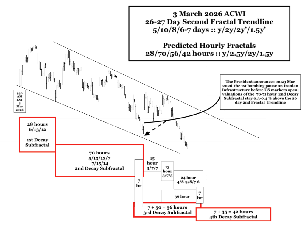 The effect of the 23 Mar 2026 premarket Presidential announcement on delaying the bombing of Iranian infrastructure. Notice the 70 hour 2nd subfractal not meeting the 26-27 day 2nd fractal Trendline.