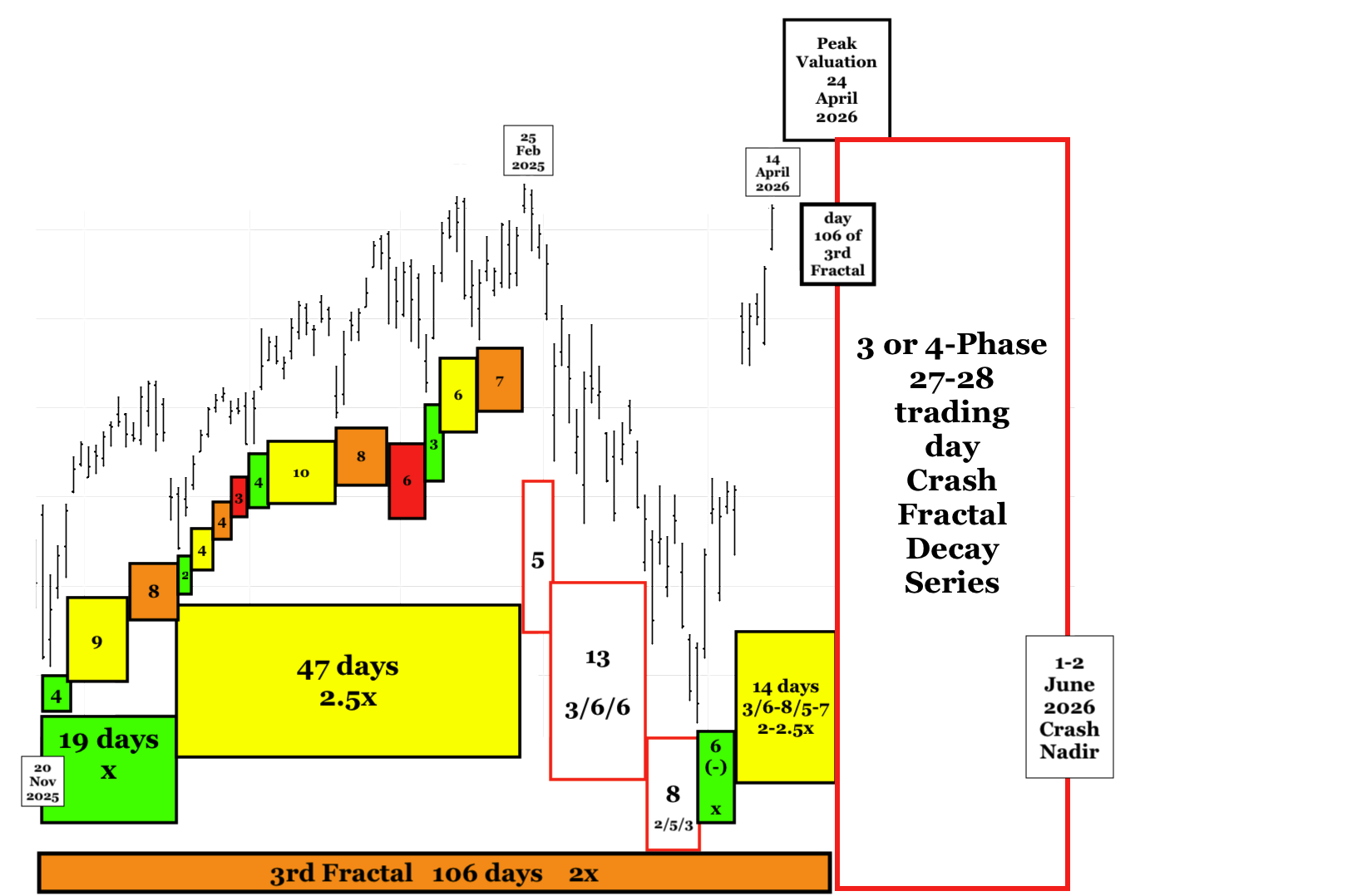 A 3-phase peak to nadir 6/14/9-10 day :: y/2-5y/1.6y fractal decay series or a 3-phase peak to nadir 5/12-13/12 day :: y/2-2.5y/2-2.5y fractal decay series or a 4-phase peak to nadir 4-5/10/10/7 day :: y/2-2.5y/2-2.5y/1.5y fractal decay series would represent the initial 27-28 day crash fractal decay series resulting an April 2026 53/107/132-133 day :: y/2y/2.5y decay series.