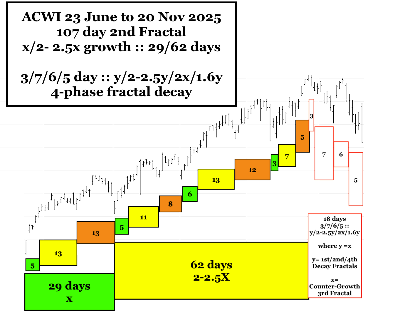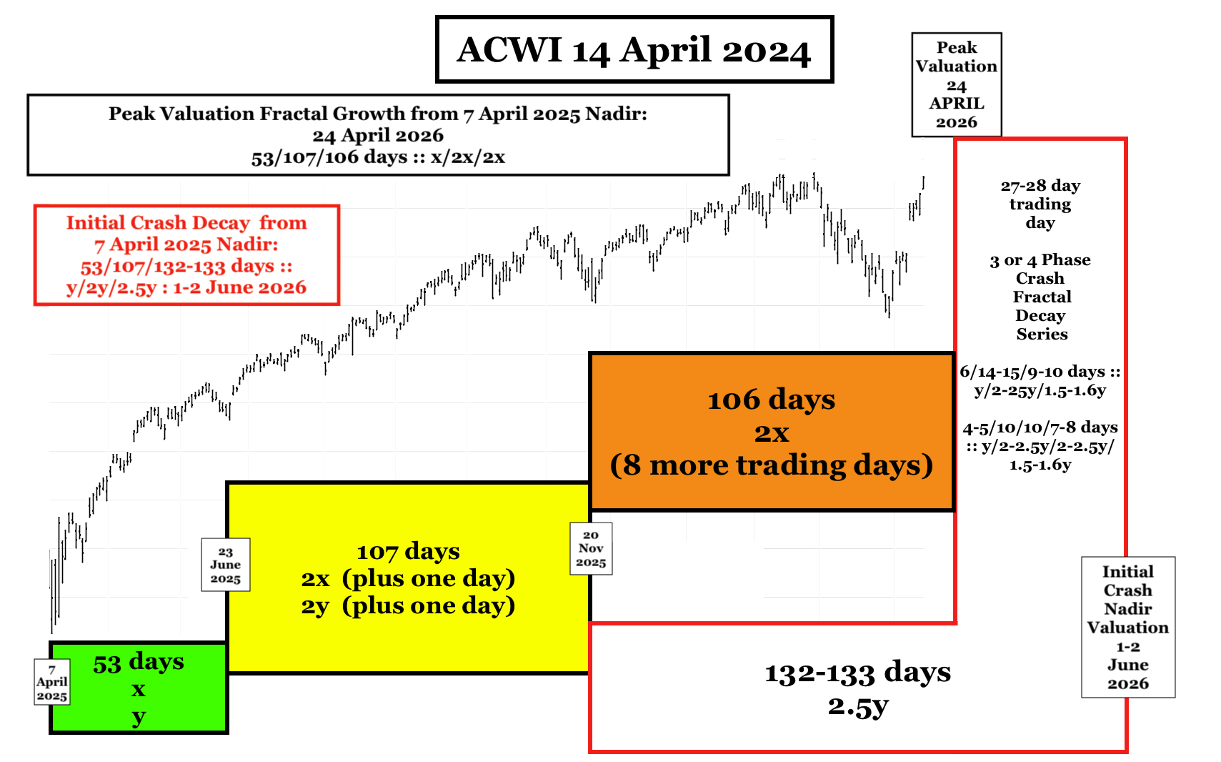 Since the 7 April 2025 nadir, maximal growth for ACWI has occurred in a 53 day/107 day/98 of 106 day :: x/2.5x/2x 3 phase fractal growth series with an expected final peak valuation on 24 April 2026. This terminal growth fractal growth series is elegantly interpolated in a 7 April 2025 53/107/132-133 day :: y/2y/2.5y incipient 3 phase fractal crash decay series.