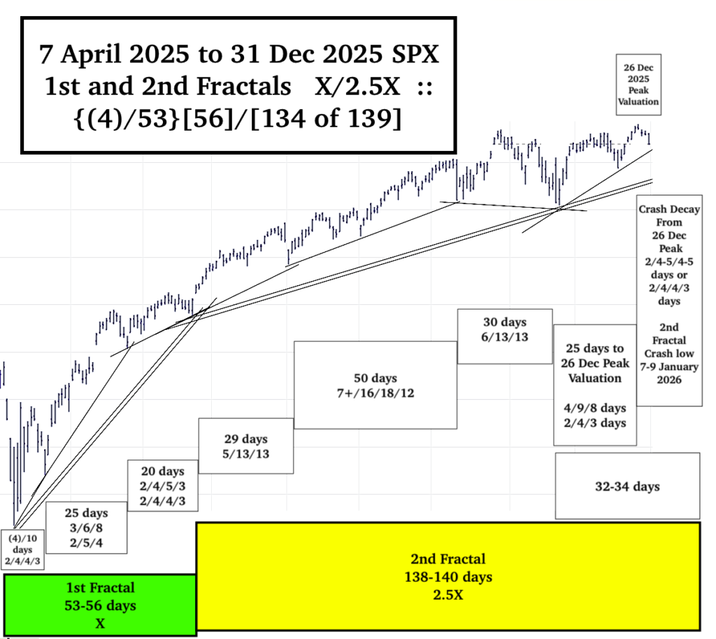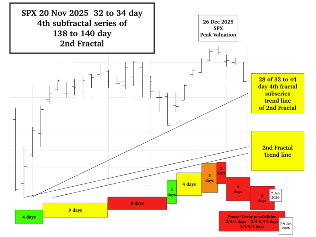 The 32-34 day 4th fractal subseries is composed of a 4/9/8 day :: x/2-2.5x/2x fractal series and a 2/4/3 day :: x/2x/1.5x fractal series to the SPX peak valuation on 26 December 2025. This 2/4/3 to peak valuation series is then completed as a 2/4/4 day :: x/2x/2x series which initiates a 26 Dec 2/4/4 day crash decay series ending 7 Jan (or a 2/4-5/4-5 day series or a 2/4/4/3 series) ending 8-9 January 2026.
