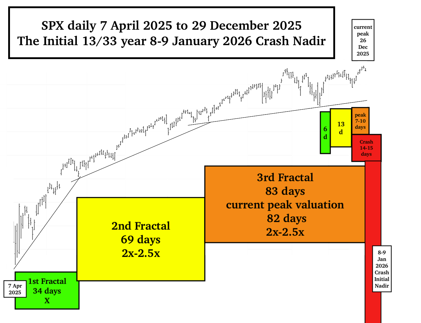 An alternative fractal interpretation is a 3-phase 7 April 2025 SPX: 34/69/83 day :: x/2x +1 day)/near 2.5x peak valuation on 26 December 2025 with the same decay crash fractal sequence.